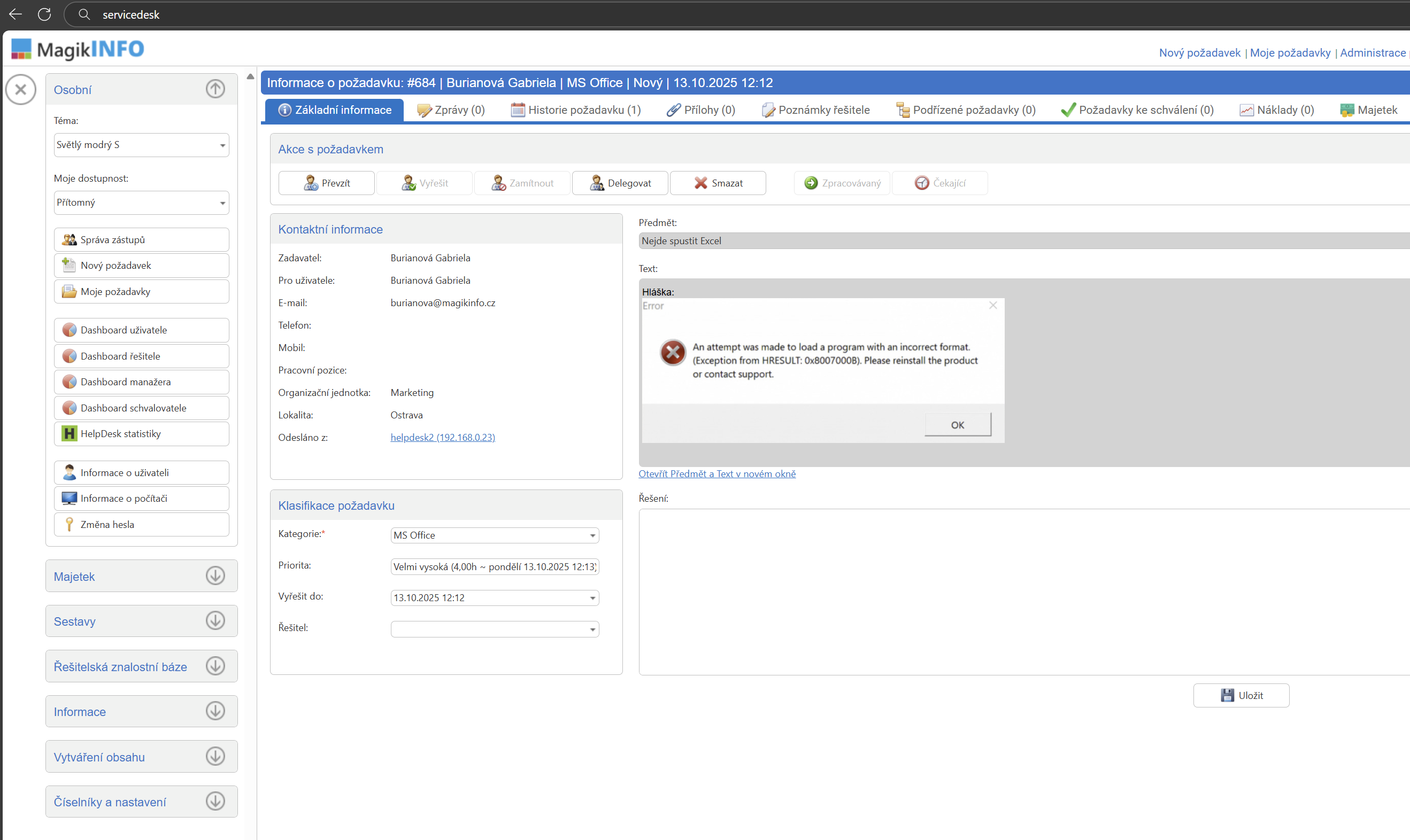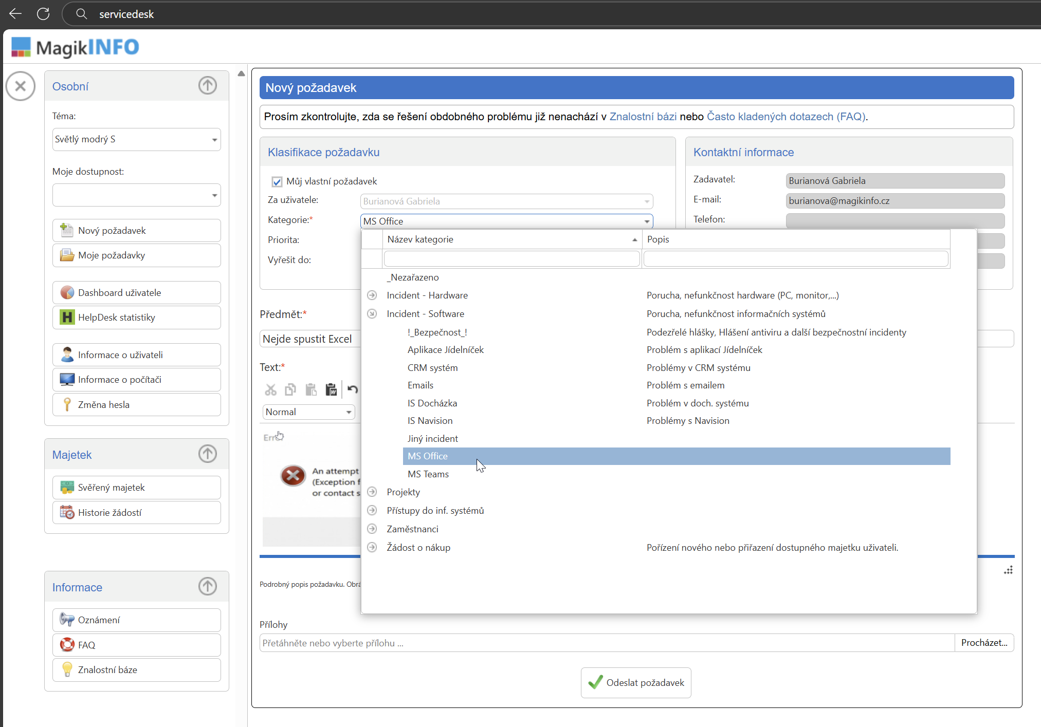 Moderní webový systém pro řízení uživatelských požadavků určený pro vnitrofiremní i externí využití. Neomezené úrovně služeb, soulad s ITIL, pracovní doby, znalostní báze, pokročilé řízení workflow, schvalovací procesy a také výstupy HW a SW konfigurace počítačů.